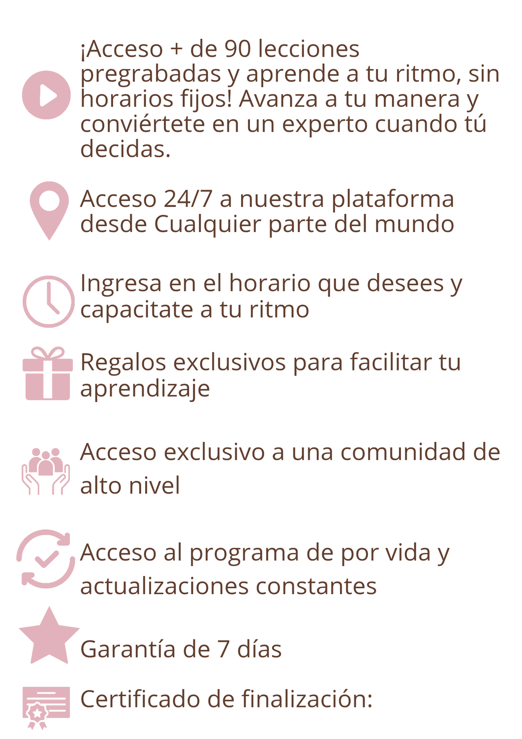 El programa está diseñado para que puedas avanzar a tu propio ritmo sin una fecha límite. Tendrás de por vida, ya que constantemente se agregan más lecciones totalmente gratis.